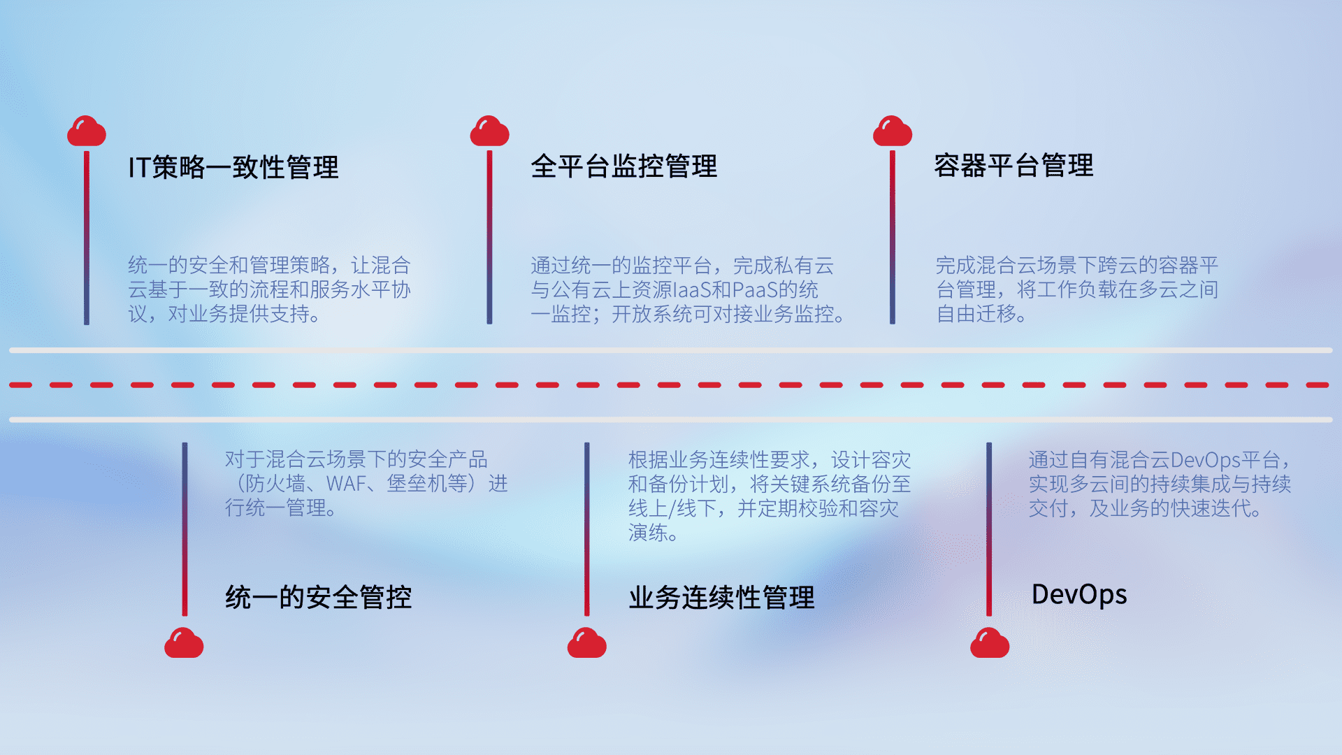 通过多云纳管,,,以统一的资源数据模型把客户的云资源进行抽象和封装,,,进而实现对多云资源的统一操作,,保障云资源管理的可靠性、、、、稳定性与可用性。。。。量身定制化运维内容,,,配置、、、、开发运维、、、补丁管理、、、、备份、、、监控、、、认证和访问管理、、审计和日常巡检等,,,保障在用云过程中的可靠度,,,,稳定度以及高可用率。。。。